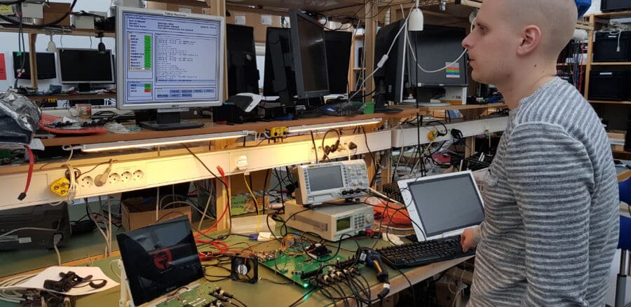 Here you can see Joakim running the very first production test on our new i.MX8MQ board. The test system is fresh from the factory and not yet mounted in its chassis yet, but will be integrated in a 19” rack before we send it to our manufacturer in Taiwan where we have our own dedicated room for production testing.